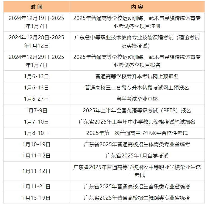 2024年12月31日,广东省教育考试院公布了2025年1月的招生考试日历。