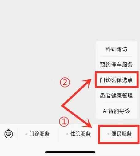 许多医院的公众号上也可以办理选点。以广州中医药大学第一附属医院为例,关注“广州中医药大学第一附属医院”微信公众号→菜单栏“便民服务”→点击“门诊医保选点”进行选点。↓↓↓