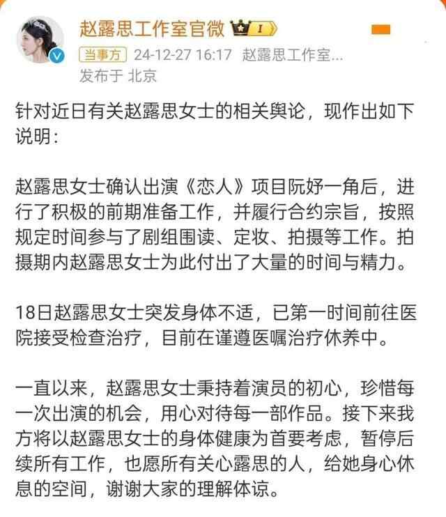 工作室透露,赵露思确认出演《恋人》“阮妤”一角,并按照规定时间参与了剧组围读、定妆、拍摄等工作,在拍摄期内付出了大量的时间与精力。“一直以来,赵露思女士秉持着演员的初心,珍惜每一次出演的机会,用心对待每一部作品。接下来我方将以赵露思女士的身体健康为首要考虑,暂停后续所有工作,也愿所有关心露思的人,给她身心休息的空间,谢谢大家的理解体谅。”2025年1月1日凌晨1点28分,赵露思在自己的视频社交平台更新了动态,这是她患病后首发动态。