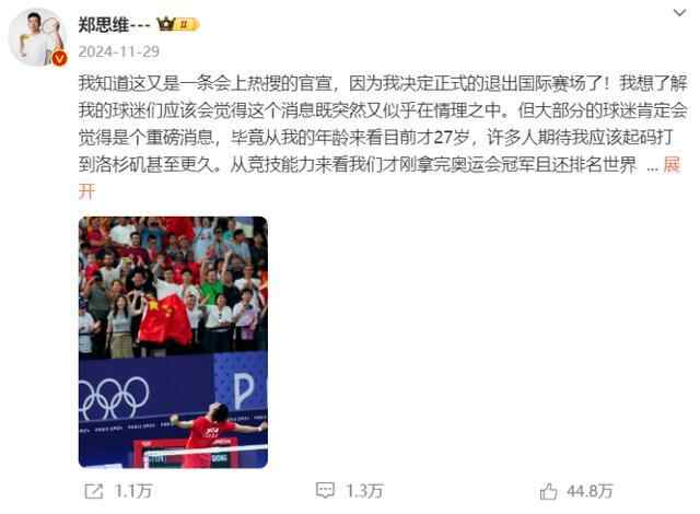 此前,在2024年11月29日上午,郑思维发长文宣布退出国际赛场,郑思维表示,这本就是他的人生规划,无论今年的巴黎奥运会上有没有圆梦,他都会做出同样的决定,原因有很多方面。