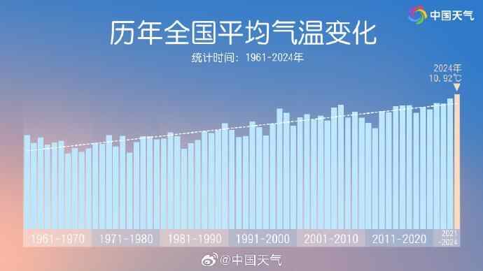 全国气温又暖出了新纪录!据悉,2024年全国平均气温为10.92℃,较常年同期偏高1.03℃,成为1961年有完整观测记录以来最暖的一年。