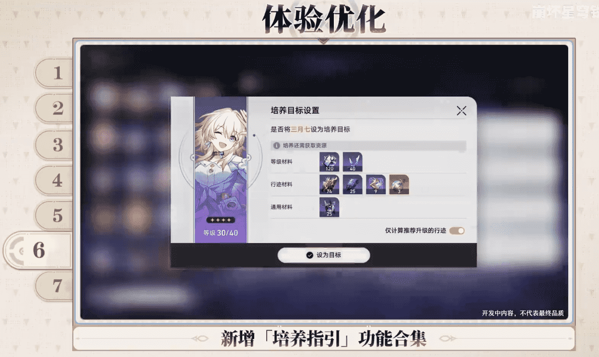 新版本更新了一系列体验优化,包括提高开拓力、沉浸器的上线,提前开放全部养成材料关卡,新增培养指引功能合集,遗器强化的定向与重掷系统,进一步改善了角色的养成体验,让玩家可以减少繁琐的操作,专注于研究配队及战斗的乐趣。