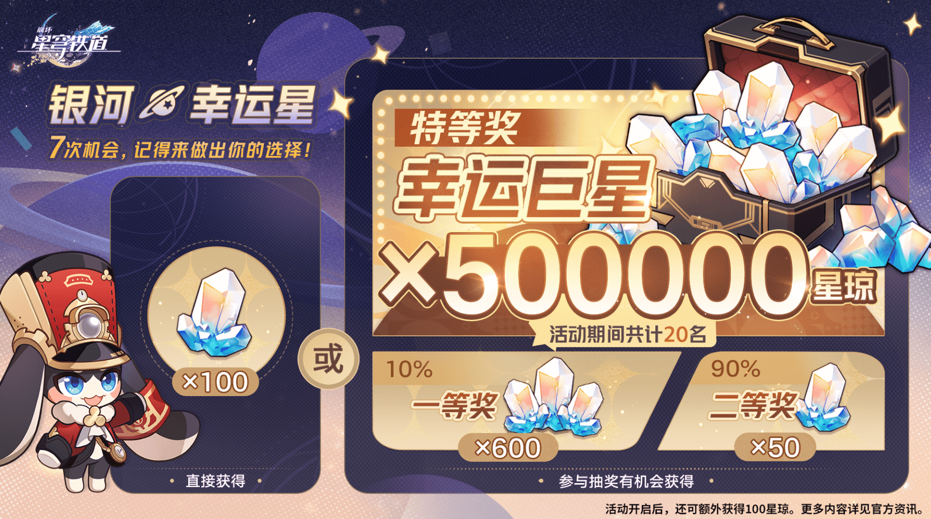 先说大家最关心的福利问题,50万星琼的活动名为“银河幸运星”,是群众最喜闻乐见的一种新春讨彩头活动——抽奖。活动开启的7天内,玩家们每天都有机会参与抽奖,最终将有20人能成为独揽50万星琼的幸运巨星,未获选的玩家也有概率获得600或50星琼,选择稳一手不参加活动则能每天稳定获得100星琼,但是这50万谁看了不馋啊,快去请赌神青雀!