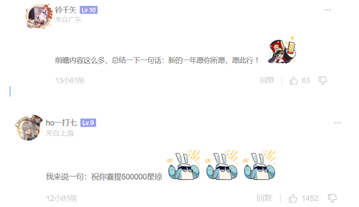有玩家在看完前瞻后感慨不愧是新年版本,喜庆的活动一茬接一茬,还有人已经率先在评论区发起了新春祝福,对今年的星铁玩家来说,最中意的祝福果然还是这一句:祝你喜提500000星琼!