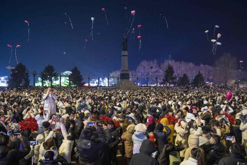 2025年1月1日凌晨,在哈尔滨市防洪纪念塔附近,人们放飞气球迎接新年。新华社记者 谢剑飞 摄