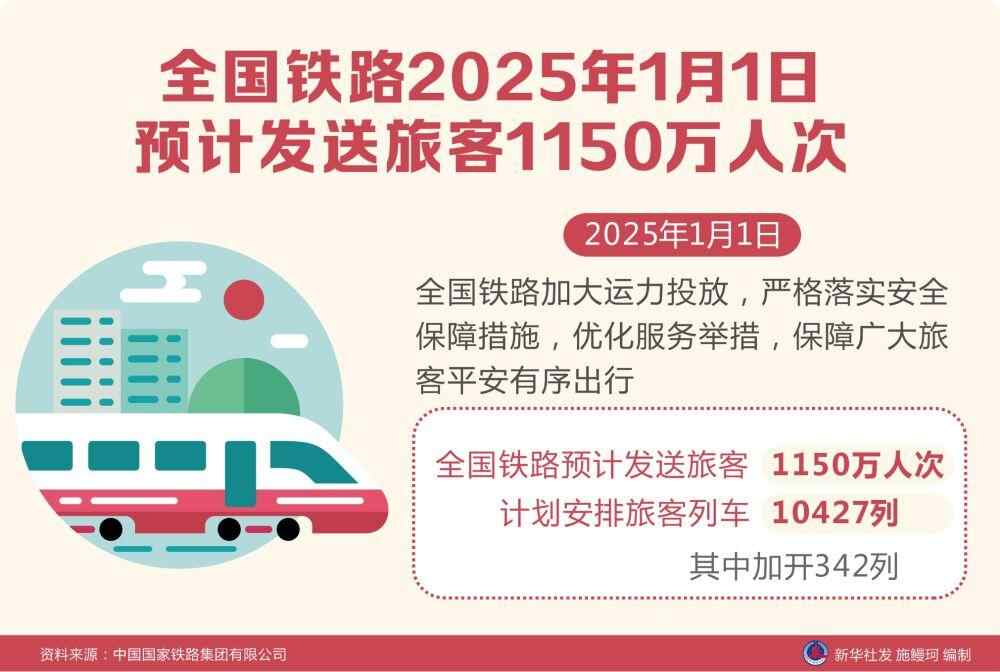 记者从中国国家铁路集团有限公司了解到,2025年1月1日,全国铁路加大运力投放,严格落实安全保障措施,优化服务举措,保障广大旅客平安有序出行,全国铁路预计发送旅客1150万人次,计划安排旅客列车10427列,其中加开342列。