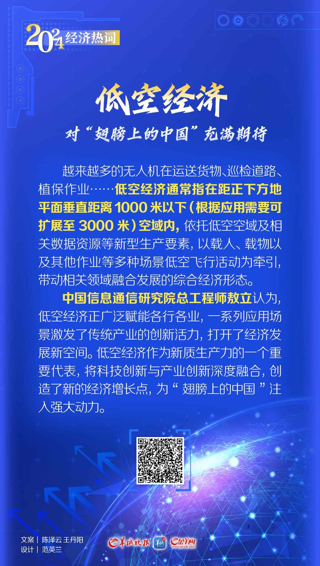 低空经济作为新质生产力的一个重要代表,将科技创新与产业创新深度融合,创造了新的经济增长点,为“翅膀上的中国”注入强大动力。低空经济拓展了数据要素的应用边界,创新性利用低空空域作为新的生产要素,并通过数字化手段实现要素深度开发和高效利用,为社会经济活动开辟了发展新空间、新模式、新业态。在科技创新方面,低空经济发挥纽带作用,大力促进航空技术与信息通信、新能源、材料科学等前沿技术的有机融合,并加速推动通信感知、算网融合、自动驾驶、群组协同等重点技术的迭代升级。在产业创新方面,低空经济为新式低空装备、新型低空智能网联设施、低空空域管理等新兴产业的培育与发展提供强大动力,加速无人机等产业从消费市场向专业领域应用渗透,开辟产业升级新思路,助力提升我国优势产业全球竞争力。
