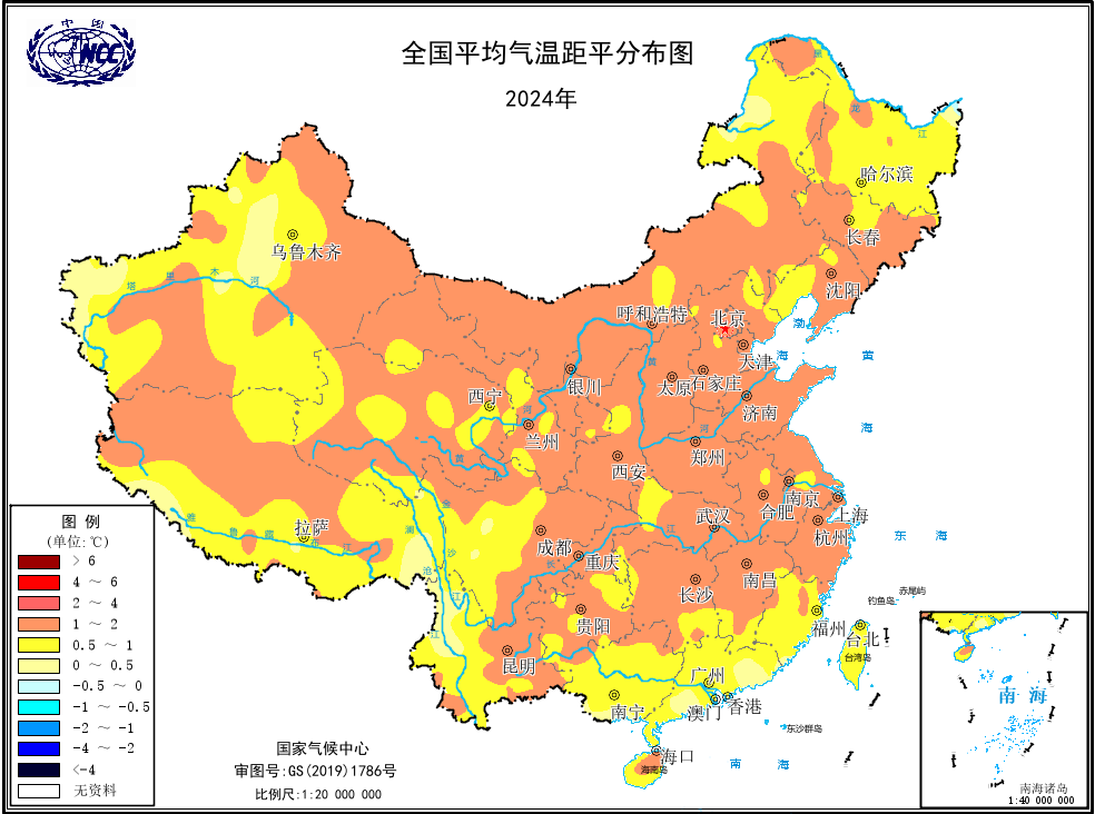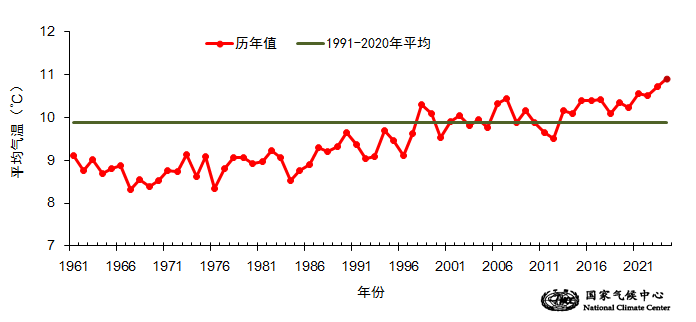 央视网消息:据国家气候中心微信公众号消息,2024年我国平均气温10.9℃,较常年(9.89℃)偏高1.01℃,超过2023年的10.71℃,再创历史新高(图1、图2)。