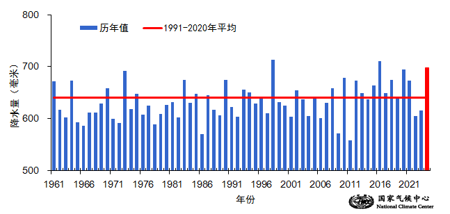 2024年,全国平均降水量697.7毫米,较常年偏多9.0%,为1961年以来历史第三多,仅次于1998年的713.1毫米和2016年的711.0毫米(图5、图6)。