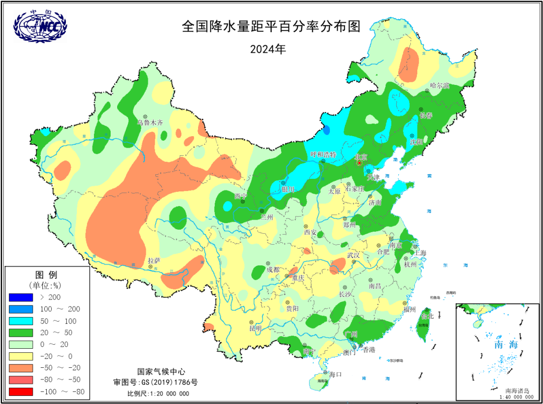 图6 2024年全国降水量距平百分率分布图(%)