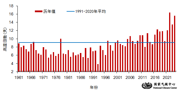 2024年,全国平均高温(日最高气温≥35.0℃)日数达15.6天,较常年偏多6.6天(图4),为1961年以来第二多,仅次于2022年。