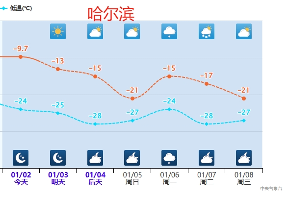 需要注意的是,由于受到冷涡影响,明天起东北地区北部等地气温将陆续转为偏低。像是哈尔滨,明起至5日最高气温以及最低气温都可能创下立冬后新低;其中,5日最高气温只有零下21℃,最低气温零下28℃,真真是天!寒!地!冻!提醒近期打算去哈尔滨旅游的小伙伴们,一定要准备好足够厚实的羽绒服和全套御寒装备。