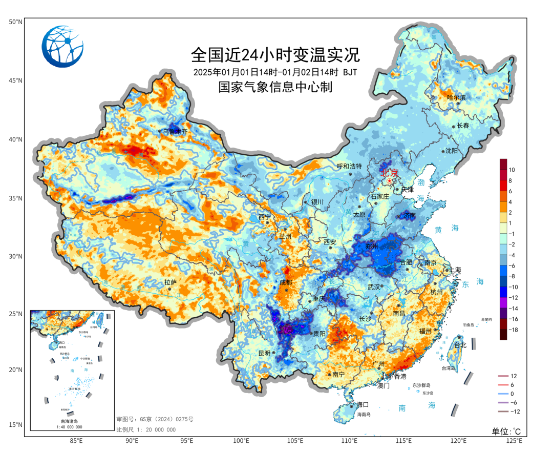 今天,一股弱冷空气正继续影响我国中东部地区。跟元旦当天同时次相比,今天14时,长江以北多地出现不同程度的降温,其中,山西北部和南部、河北北部、河南、山东、湖北北部等地降温明显,降幅普遍有4至8℃,局地接近10℃。