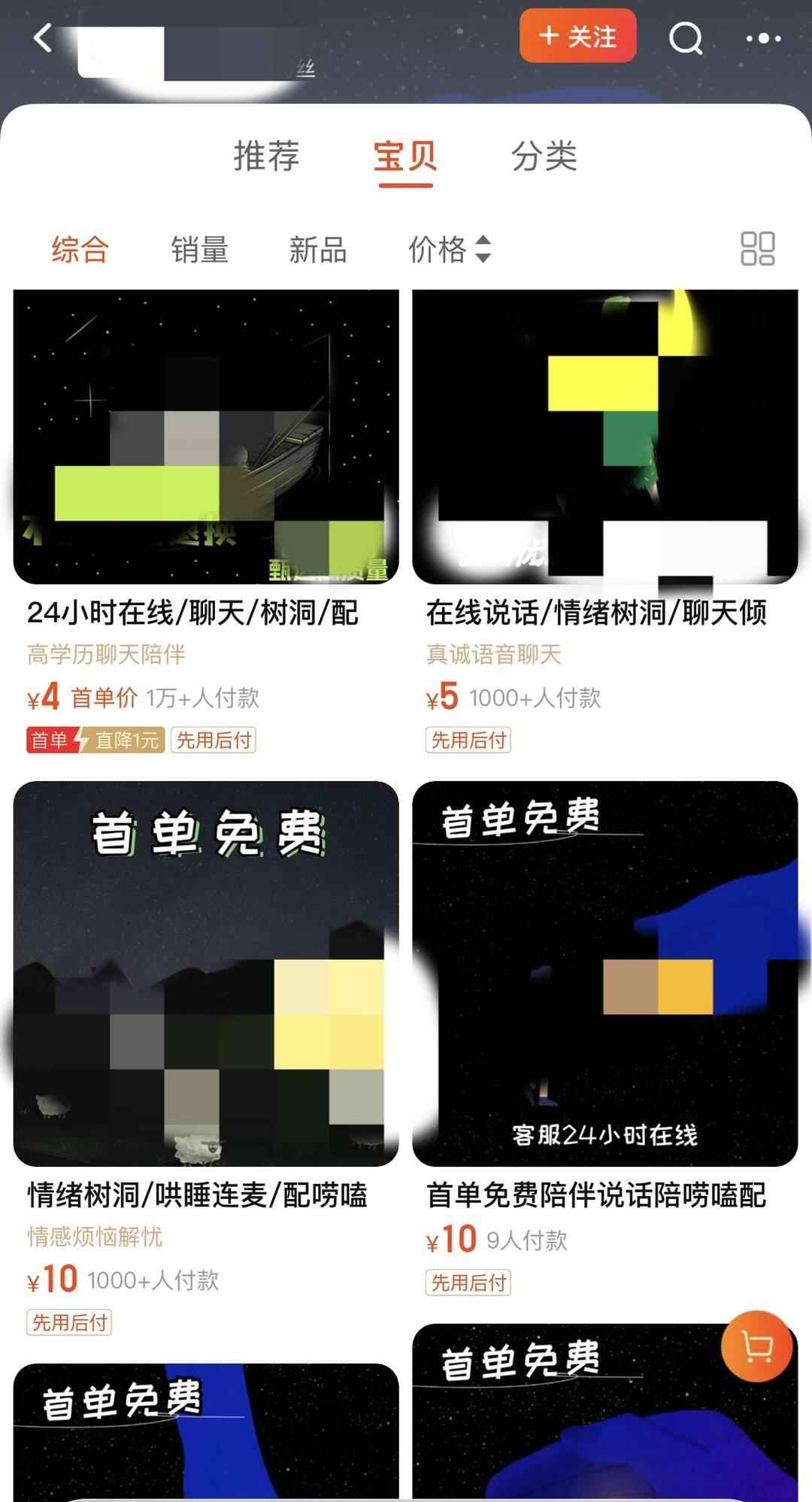 店铺的商品名称一般是“24小时在线\聊天|树洞|情感倾听师”这样的标题。商品介绍里显示,陪伴聊天的费用根据倾听师的等级不同,价格也不同,一般在60元至300元每50分钟。