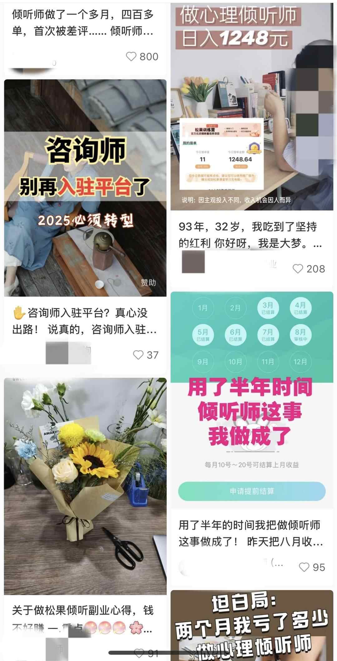 据业内人士介绍,倾听师目前的从业人员大多是宝妈,集中在二三线城市,年龄在28 - 40岁。此职业未被列入人社部新职业,与心理相关的职业中只有咨询师被收录,而倾听师相对咨询师门槛较低,不需要证书,只要掌握倾听和共情技能即可,属于咨询师的“前身”。