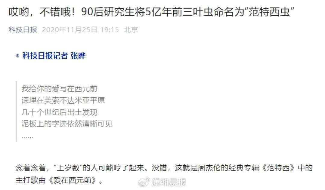 2020年,中国科学院南京地质古生物研究所硕士研究生孙智新,把他发现的一种5亿年前的独特三叶虫命名为范特西虫。孙智新表示:“‘周董’的歌对我影响很大,这次用范特西命名,也是向周杰伦天马行空的音乐创作风格致敬,算是一种理科生的浪漫吧。”