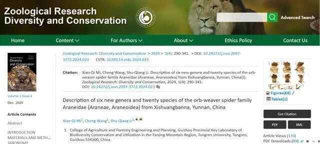 近日,Zoological Research: Diversity and Conservation杂志发表了一篇版纳植物园蜘蛛分类研究论文,其中包含园蛛科6个新属16个新种,16个新种分别是: