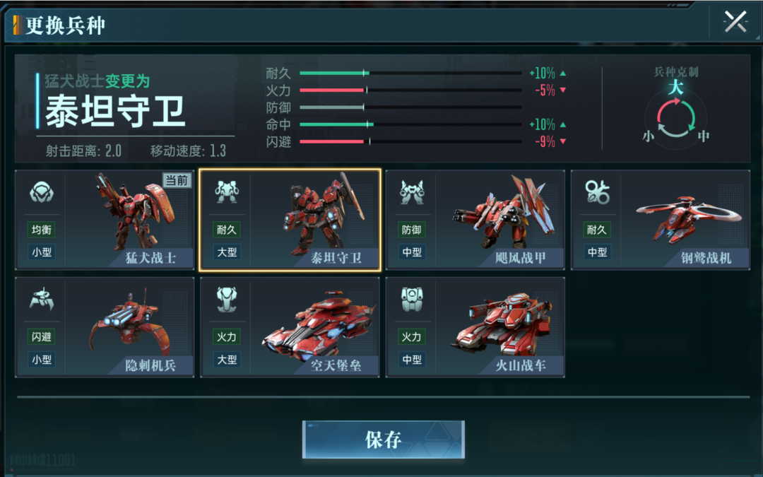 《群星纪元》的兵种被分成了大、中、小三种形态,这三种形态天然互相克制,同时每个兵种都具有独特的可切换形态或者主动技能。例如泰坦守卫可以切换为防御姿态获得高额减伤;初始形态是地面部队的飓风战甲可以切成空中形态飞越地形,产生对空优势;钢鹫战机可以切换为专门治疗单位的医疗艇;隐刺机兵可以主动隐形打出破隐一击等等。