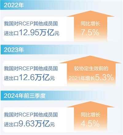 RCEP是世界上参与人口最多、经贸规模最大、最具发展潜力的自由贸易协定。自2022年1月正式生效以来,RCEP持续释放关税减免、通关简化、贸易投资便利化等制度红利,强化区域产供链稳定畅通,推动亚太地区经济进入高质量发展新阶段。中国是RCEP最大经济体,也是高质量实施RCEP的积极推动者。据中国海关总署统计,2022年,中国对RCEP其他成员国进出口12.95万亿元,同比增长7.5%;2023年,中国对RCEP其他成员国进出口12.6万亿元,较协定生效前的2021年增长5.3%;2024年前三季度,中国对RCEP其他成员国进出口9.63万亿元,同比增长4.5%。