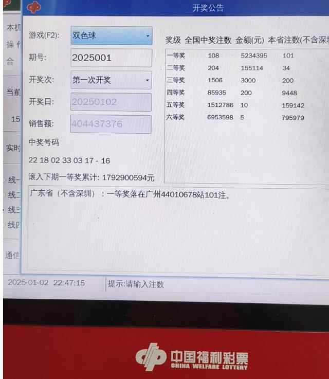 1月2日,福彩双色球迎来2025年首期开奖,当期开奖号红色球为02 03 17 18 22 33,蓝色球为16。开奖公告显示,全国共中出一等奖108注,其中广州一站点独中101注。