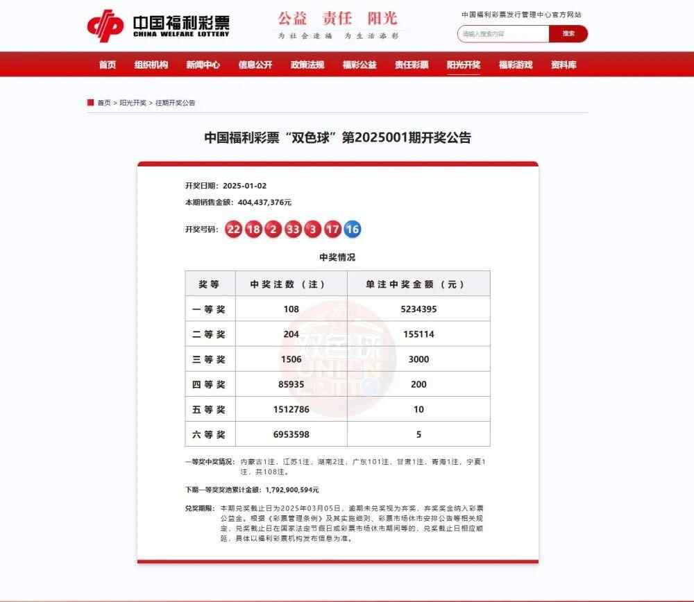 1月2日,福彩双色球迎来2025年首期开奖,当期开奖号红色球为02 03 17 18 22 33,蓝色球为16。开奖公告显示,全国共中出一等奖108注,其中广州一站点独中101注。