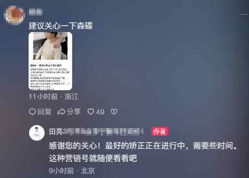 该网友晒出一张截图称“建议关心一下森碟”,截图上有森碟的近照,还有一段文字称“森碟下巴后缩好严重,看评论说已经错过了最佳矫正时期了,父母怎么不管管”,对此,田亮回复称“感谢您的关心!最好的矫正正在进行中,需要些时间。这种营销号就随便看看吧!”