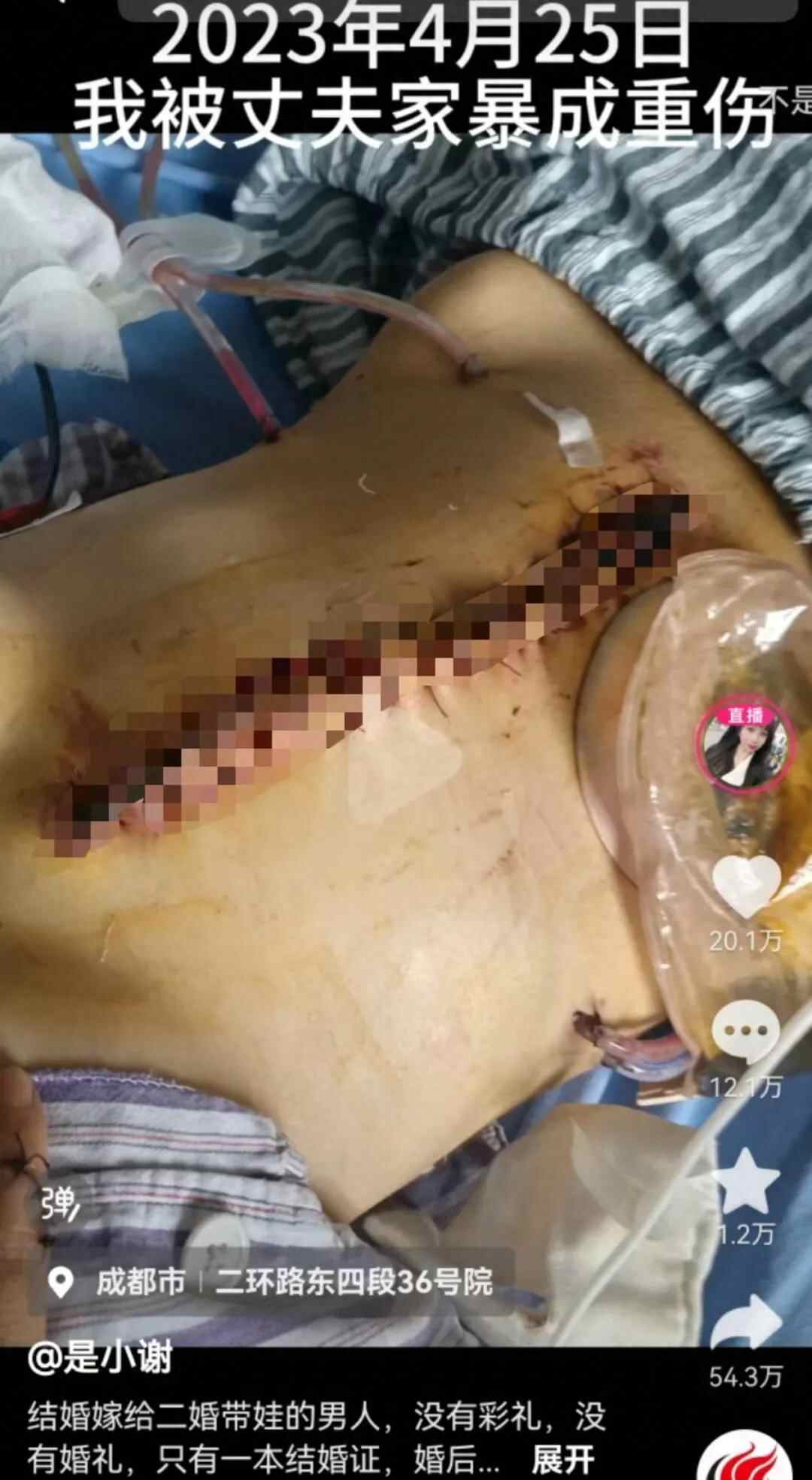 据此前报道,2021年7月到2023年4月,小谢在结婚期间被贺某阳家暴16次,造成左肾功能完全丧失,鉴定为4个重伤二级、5个轻伤二级和1个轻微伤。其三根肋骨骨折,十二指肠被污染,小肠梗阻,内脏不同程度损伤,腹部到胸部留下一道30厘米的伤口,占身体的五分之一,且需要终身挂粪袋生活。