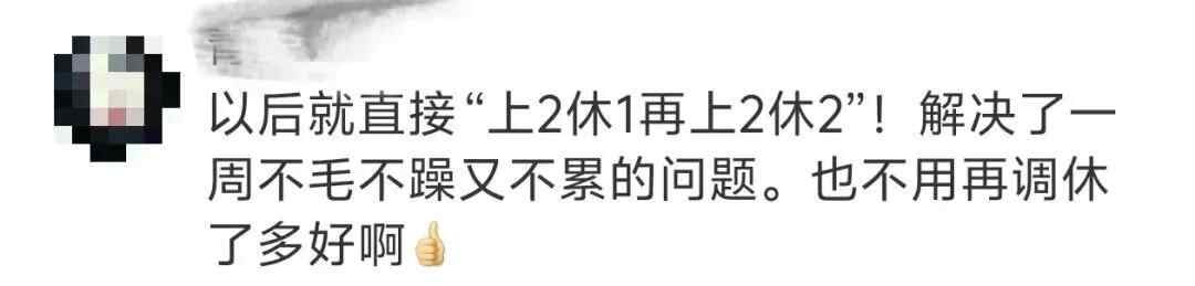 对于“上二休一上二再休二”的模式,部分网友表示“已上瘾”,希望以后有更多的机会能在一周时间里“上四休三”。但大多数网友也承认,从现实角度考虑,绝大多数单位和企业都没办法频繁接受员工“上四休三”。