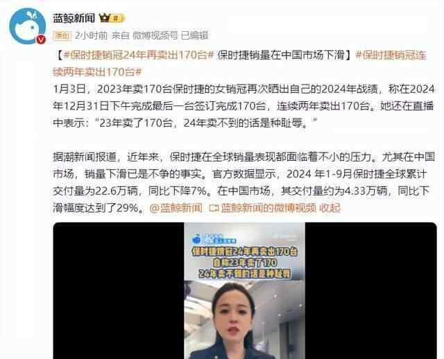 1月3日,据媒体报道,曾在2023年卖出170辆保时捷的女销冠再次晒出自己的2024年战绩,称在2024年12月31日下午完成最后一辆签订,2024年共卖出170辆保时捷,连续两年卖出170辆。