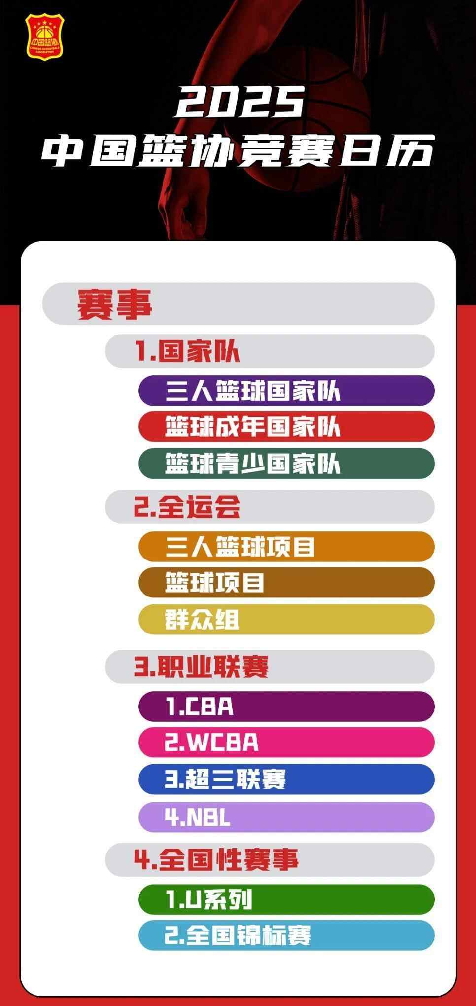 日前,中国篮球协会发布2025年的竞赛日历,所有赛事按照编排赛历时的优先程度分为5个层级,包括各级国际比赛、职业联赛等。中国篮协相关人士表示,这次对外公布的只是前四个层级的已确定赛事。中国篮协和学体联联合主办的一些教育系统的赛事属于第五个层级,待有关细节确定后也会公布。