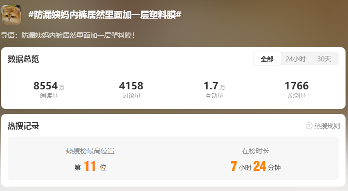 1月3日,有棵树防漏生理期内裤“里面加了一层塑料膜”登上热搜。