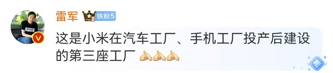 雷军在评论区回复:这是小米在汽车工厂手机工厂投产后建设的第三座工厂。