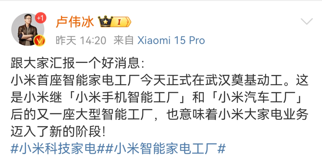 据小米集团合伙人、总裁@卢伟冰微博:11月26日小米首座智能家电工厂正式在武汉奠基动工。