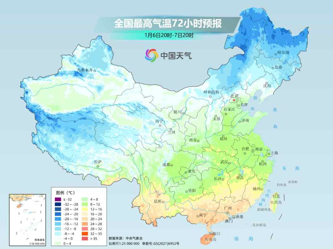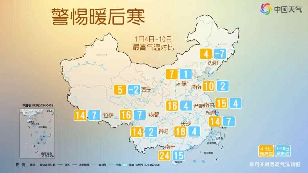 在这股冷空气影响期间,南方多地由于后期受到雨雪天气影响,最高气温累计下滑幅度会超过10℃;北方多地气温累计降幅也会达到4至8℃。到1月上旬收尾时,中东部气温会陆续降到较常年同期偏冷的状态,多地气温还将刷新入冬后新低。