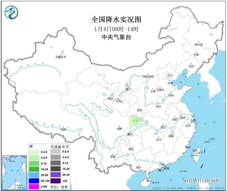 今天白天,全国大部仍然是降水稀少,只在西北地区东部和四川盆地等地,雨雪天气匆匆而过。其中,西宁到兰州一带出现降雪,四川东北部和重庆北部等地出现降雨。