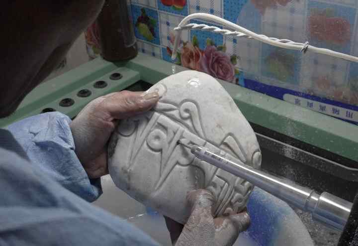 2024年10月17日,村民在岗巴布民族手工艺品专业合作社内雕刻玛尼石(视频截图)。新华社发(杜笑微摄)