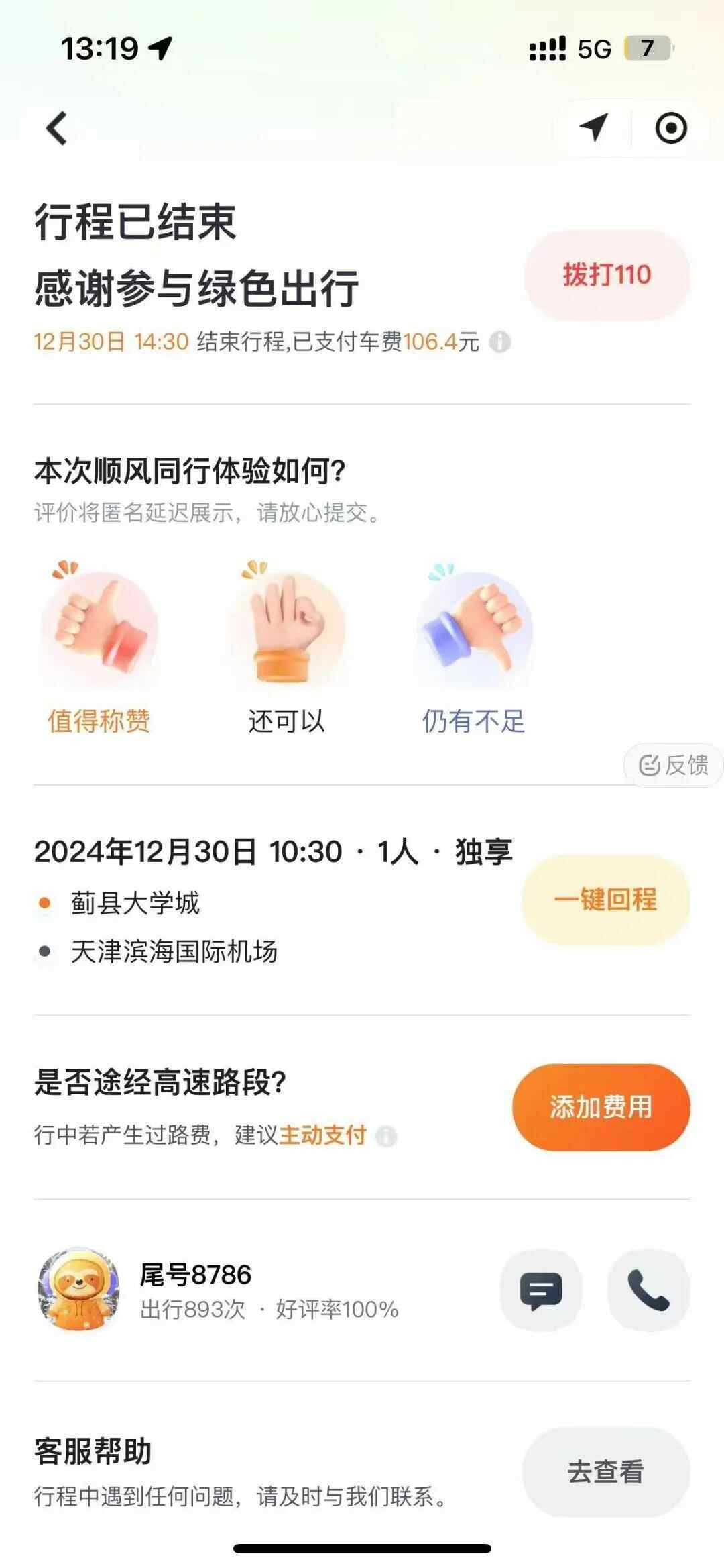 1月4日,羊城晚报记者联系上爆料网友小康。小康是一名在校大学生,今年19岁。据她讲述,2024年12月30日上午,她在嘀嗒出行下单了独享顺风车,从天津蓟州大学城赶往天津滨海国际机场。上车前,司机联系小康称车上有一名自己的亲属,如果她不介意,可以为她减少15元车费。