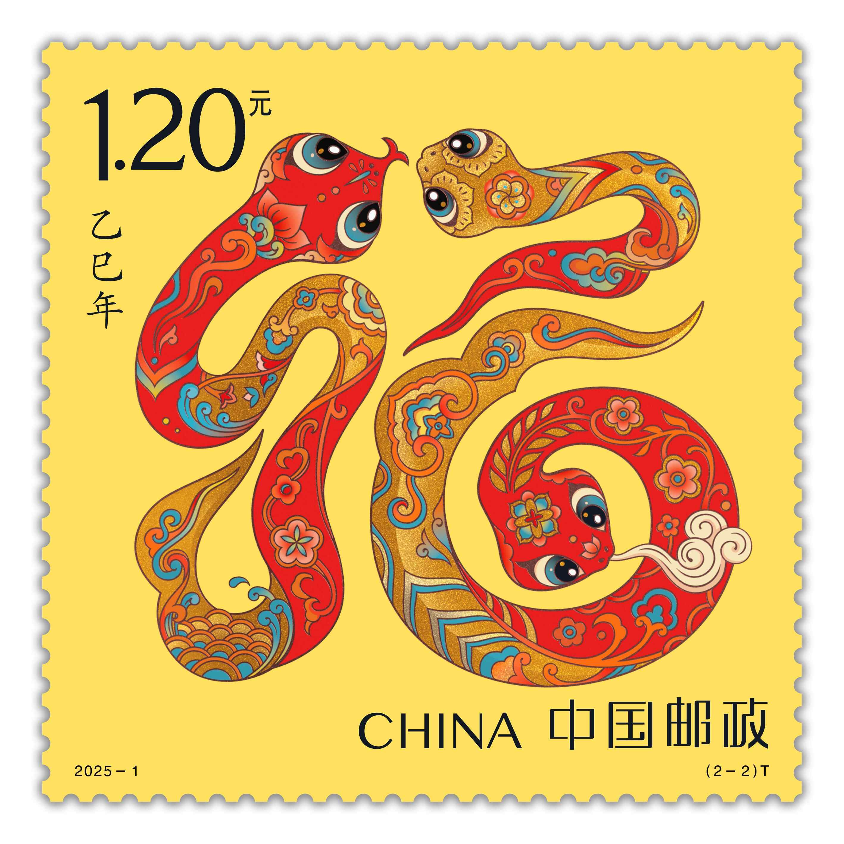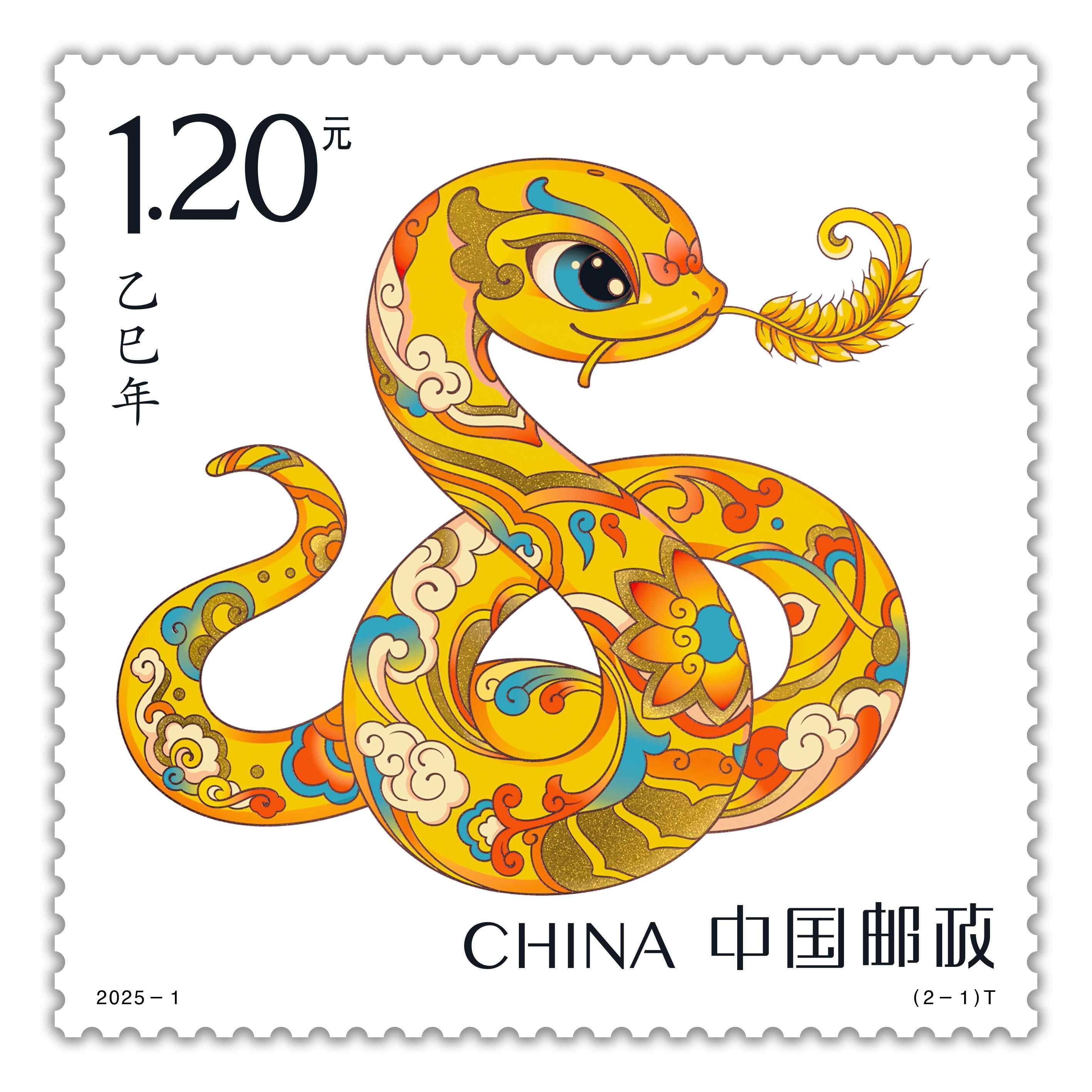 记者看到,邮票一套两枚,第一枚图名为“蛇呈丰稔”,画面提炼了中华传统文化中盘蛇的灵动意象,加以喜庆装饰应和年节氛围。金色的蛇躯蜿蜒,口中衔着一束“嘉禾”,象征着“仓廪实,衣食足”的美好图景。蛇身金光熠熠,与璀璨的麦穗交相辉映,仿佛绘就了一幅丰收时节金光灿烂、富饶满溢的画卷,寓意着风调雨顺之年,五谷丰登之景,以及国泰民安的盛世祥和。