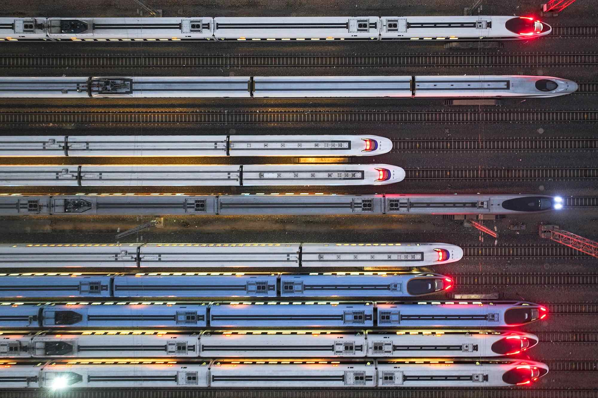 南京,动车组列车整齐停放在南京动车段南京南动车运用所存车线上。