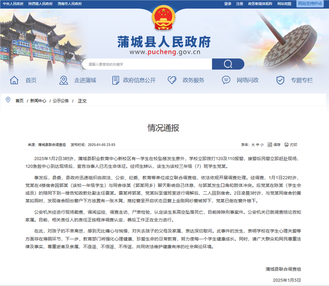 1月5日深夜,蒲城县联合调查组就“一学生在校坠楼发生意外”发布情况通报,通报全文如下: