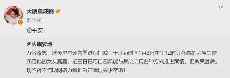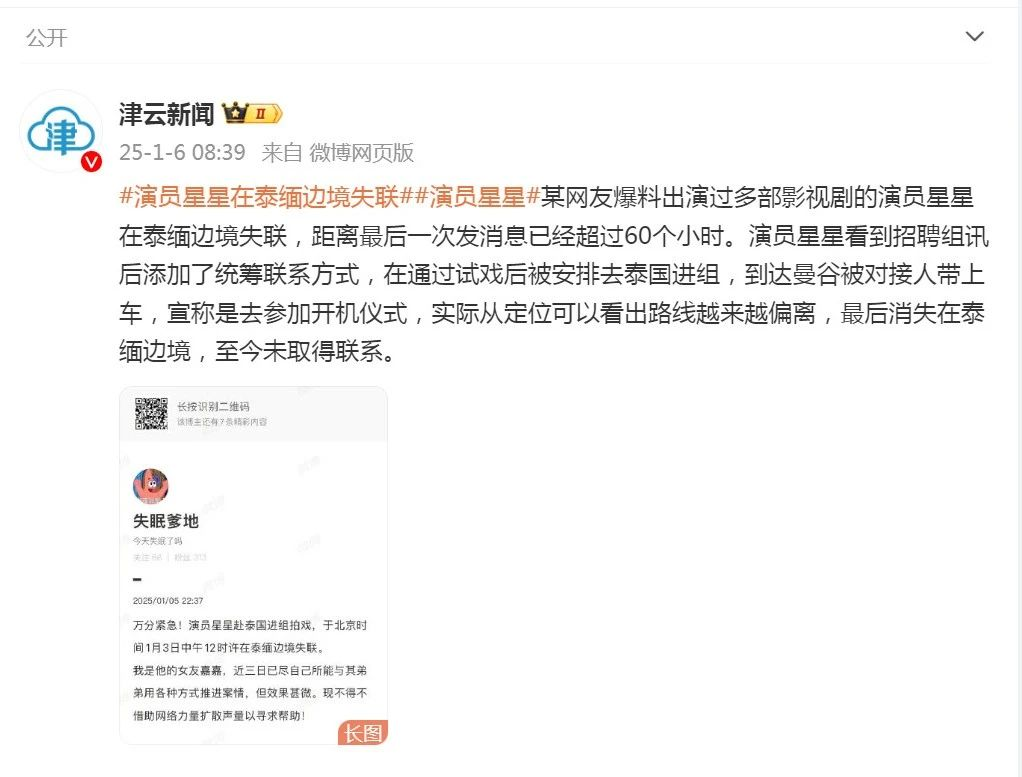 1月5日,自称是演员星星的女友嘉嘉发文:演员星星赴泰国进组拍戏,于北京时间1月3日中午12时许在泰缅边境失联。我是他的女友嘉嘉,近三日已尽自己所能与其弟弟用各种方式推进案情,但效果甚微。现不得不借助网络力量扩散声量以寻求帮助。