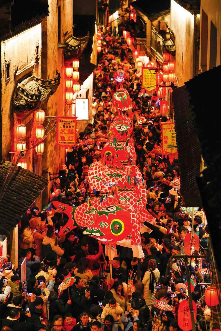 在安徽省黄山市歙县北岸镇瞻淇村,村民舞动非遗鱼灯,吸引了众多游客 (2024 年 12 月 31 日摄) 施亚磊摄 / 本刊