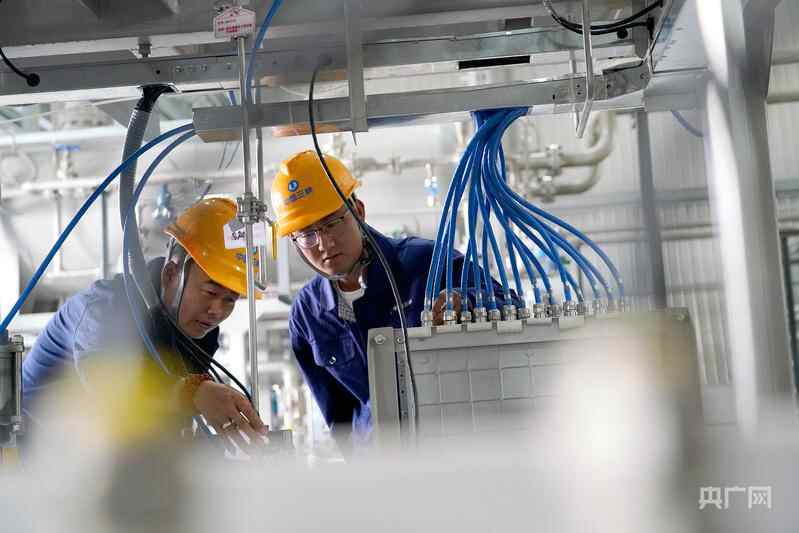 内蒙古鄂尔多斯,工人利用光伏发出的绿电制取绿氢