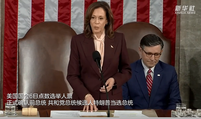 依据选举程序,美国国会参众两院当天举行联席会议,由美国现任副总统、2024年美国总统选举民主党候选人哈里斯(上图)主持。哈里斯依次递交各州及华盛顿特区的选举人票投票结果,由两名参议员和两名众议员轮流唱票。