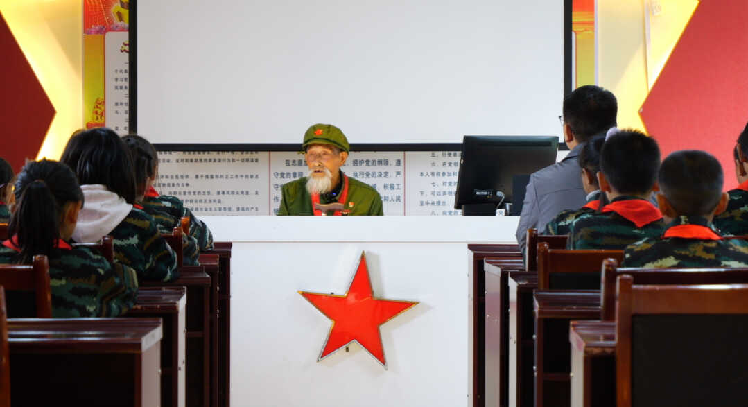 92岁的退役军人陈彪老人将军山小学学生讲述红军的故事。