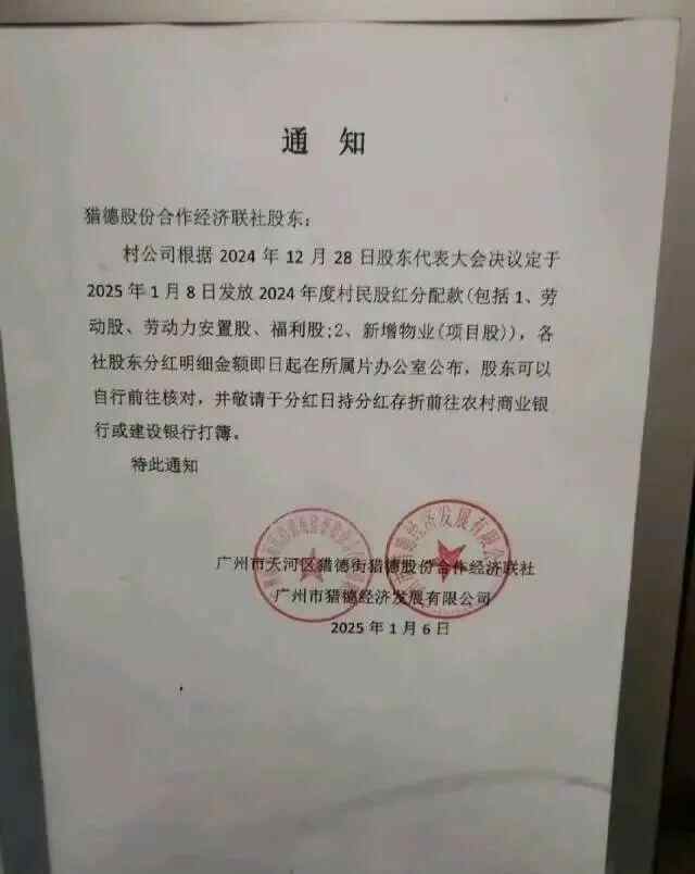 通知显示,猎德股份合作经济联社和猎德经济发展有限公司根据2024年12月28日股东代表大会决议,定于2025年1月8日发放2024年度村民股红分配款。