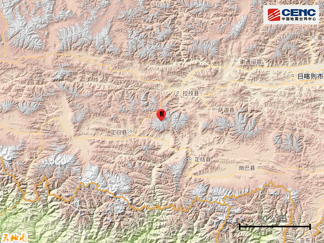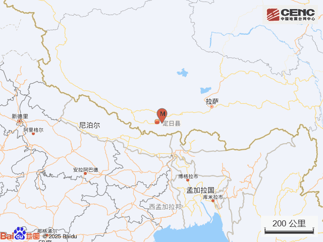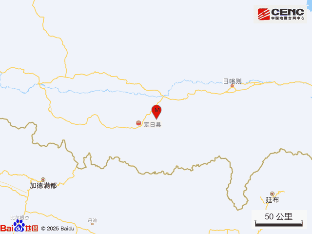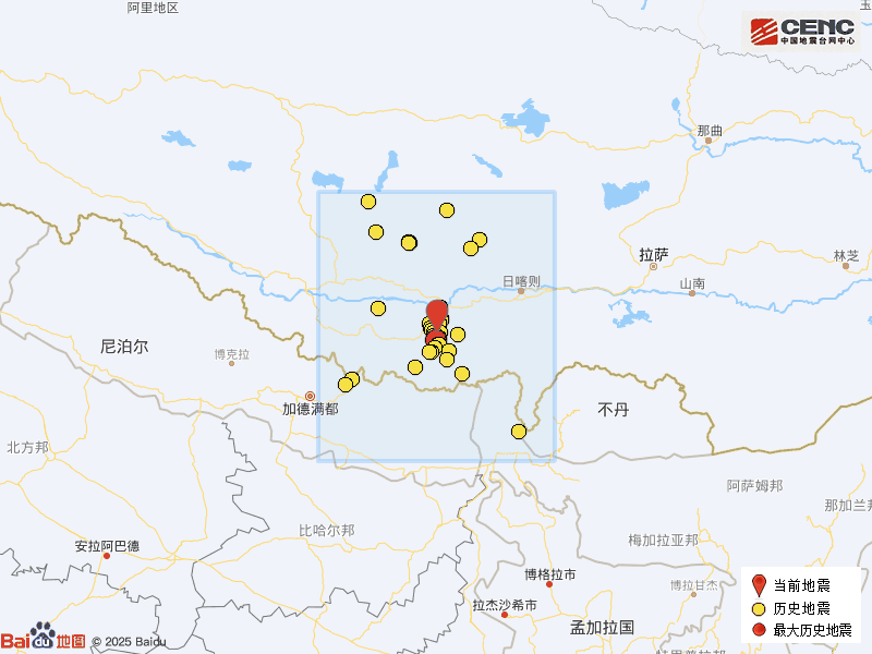 历史地震:根据中国地震台网速报目录,震中周边200公里内近5年来发生3级以上地震共59次,最大地震是2025年1月7日在西藏日喀则市定日县发生的6.8级地震(距离本次震中30公里),按震级大小前50次历史地震分布如图。