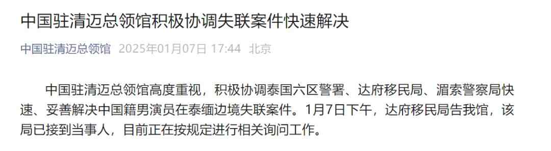 稍早前,1月7日下午,中国驻清迈总领馆发文称“中国驻清迈总领馆高度重视,积极协调泰国六区警署、达府移民局、湄索警察局快速、妥善解决中国籍男演员在泰缅边境失联案件,1月7日下午,达府移民局告我馆,该局已接到当事人,目前正在按规定进行相关询问工作。”