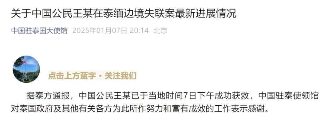 1月7日20时许,中国驻泰国大使馆发文称,据泰方通报,中国公民王某已于当地时间7日下午成功获救,中国驻泰使领馆对泰国政府及其他有关各方为此所作努力和富有成效的工作表示感谢。