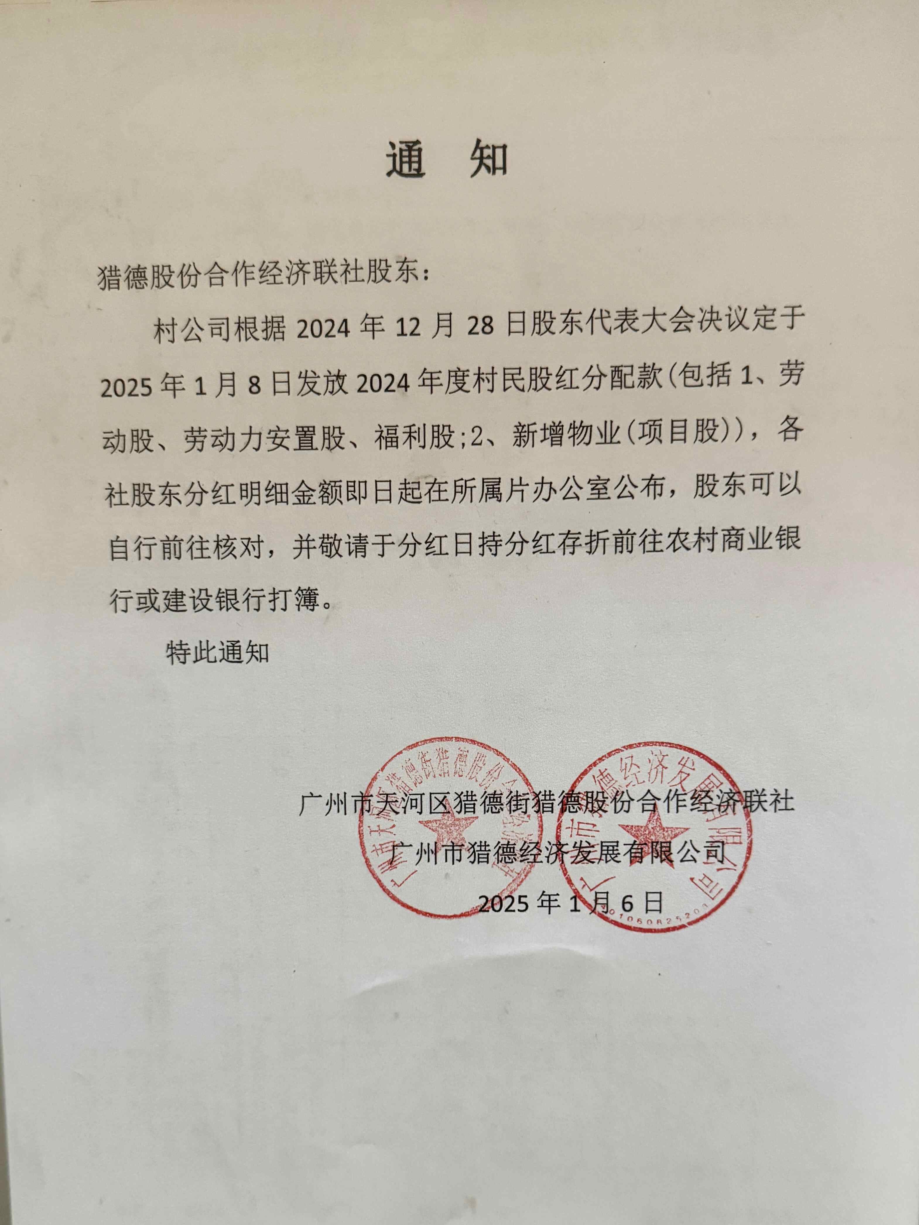 记者在猎德村实地走访时看到,村内确实张贴了白底黑字的通知,与网上疯传的通知照片一致。该通知由广州市天河区猎德街猎德股份合作经济联社、广州市猎德经济发展有限公司发布,明确村公司根据2024年12月28日股东代表大会决议,定于2025年1月8日发放2024年度村民股红分配款,分红包括两项:一是劳动股、劳动力安置股、福利股;二是新增物业(项目股)。
